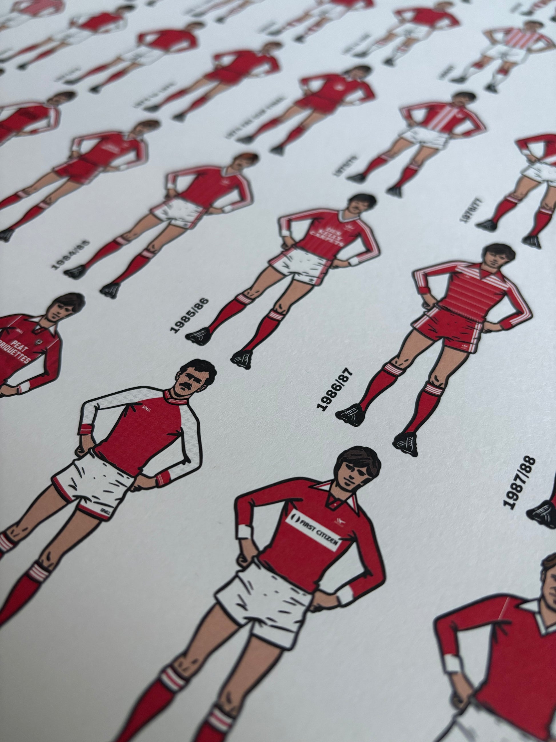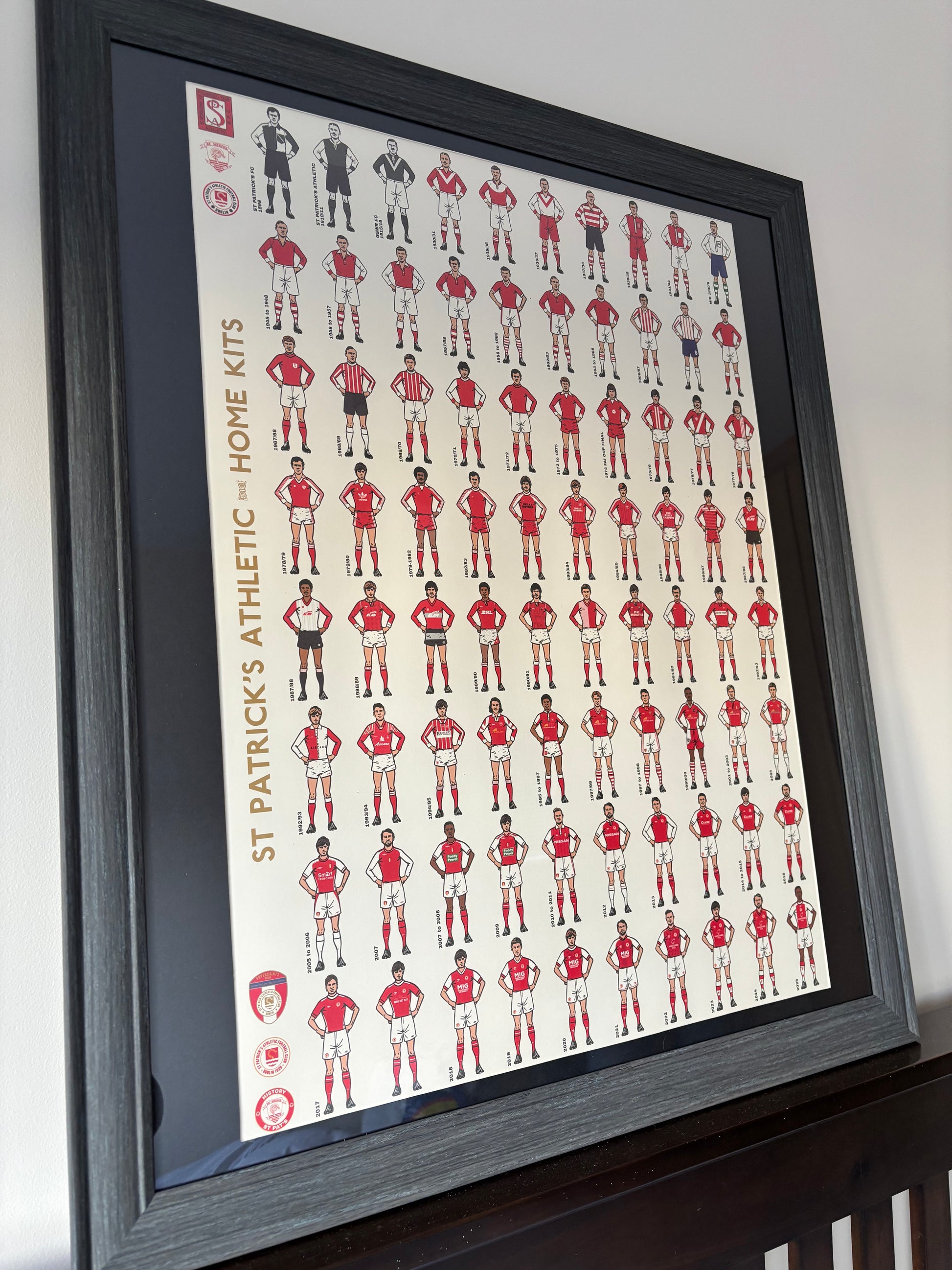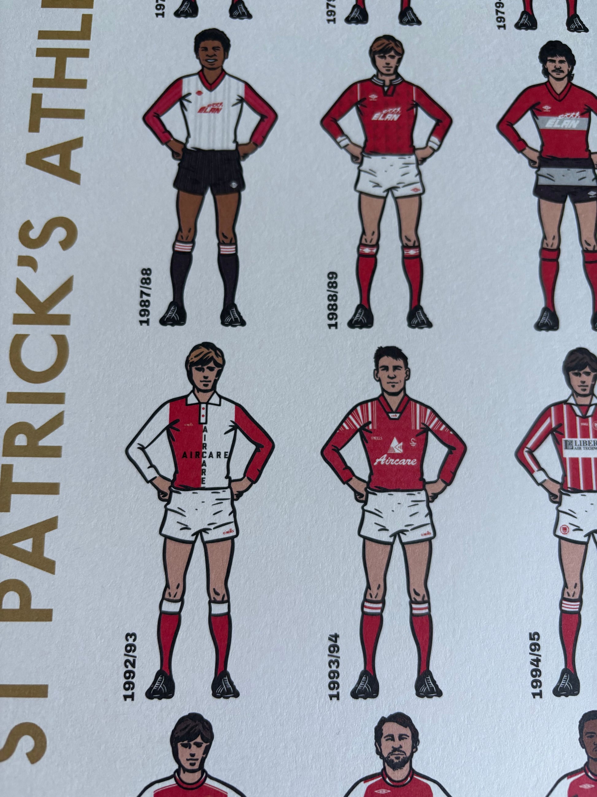 A limited-edition art print lovingly created by renowned football artist Peter O'Toole after months of original research by the History St Pat's project. The art print features 80 separate drawings of Pat's home kits from the predecessor clubs and early days of the club right through to modern kits with sponsors and complex designs. This is the first time a full history of Pat's kits has ever been published in any format.